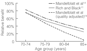 Relative life-expectancy benefits (and quality-adjusted relative life-expectancy benefits) of screening in women over 70 compared with women aged 50–69 years are shown in Box 2. For example, for the Rich and Black model,11 if we regard women in the base group (50–69 years) as experiencing 100% benefit from mammographic screening, then women 70–74 years will experience about three-quarters of that benefit, and women 75–79 years will experience about half the benefit (Box 2). When available, similar information is presented for quality-adjusted life expectancy. For example, from the model by Kerlikowske et al,12 we estimate that women aged 69–79 years will experience about 40% of the benefit experienced by women 50–69 years old, but, when quality of life adjustment is made, women 70–79 years experience only about 18% of the benefit experienced by younger women.