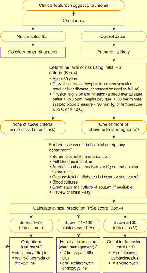 In the United States, a prospectively validated severity prediction score is increasingly used — the Pneumonia Severity Index (PSI).19,20 The method of scoring this index is shown in Box 4, and risk of death in different PSI risk classes in Box 5. The rule was derived in patients aged over 18 years who were HIV-antibody negative and had not been in hospital during the previous seven days, although they included nursing home residents. Strictly, the PSI score identifies predictors of mortality and was not originally designed to triage patients or guide prescribing. However, high PSI scores correlate with admission to hospital and an intensive care unit, and there is limited evidence that the score correctly identifies patients who can be safely managed in the community with oral antibiotics.20
