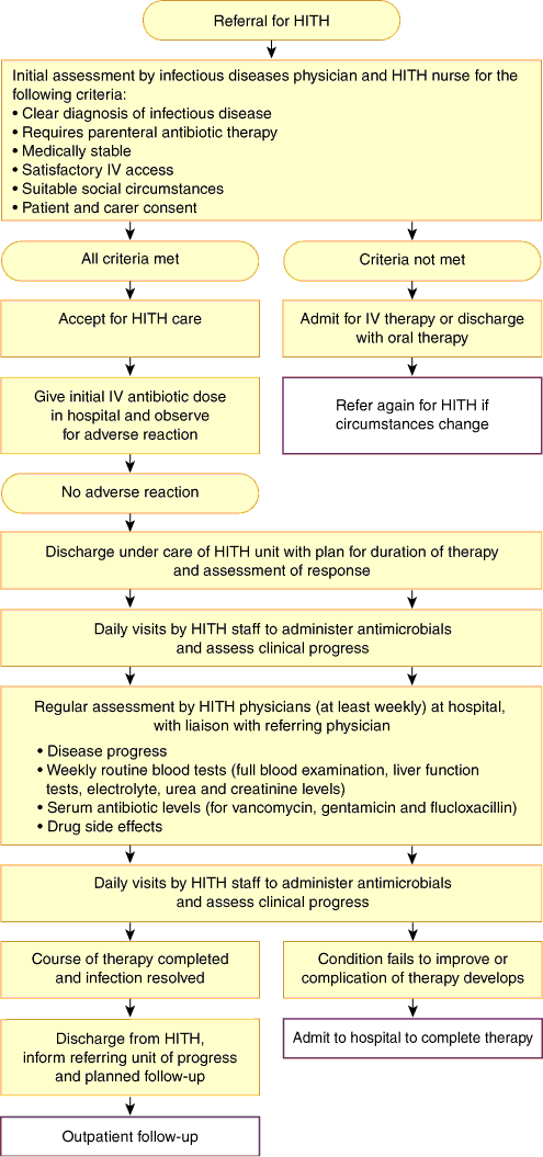 Selecting patients and implementing an HITH program requires a multidisciplinary approach, with contributions from clinicians and nurses, as well as pharmacists, who assist with appropriate antimicrobial choice and preparation. However, the ultimate legal responsibility for the quality of care and outcome of HITH rests with the clinician.2,12 HITH clinicians need to be experienced in treating infectious diseases and to have a clear understanding of antimicrobial pharmacokinetics. As HITH is becoming increasingly specialised, they also need a special interest in HITH and understanding of the management of complex conditions at home.