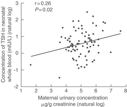There was a positive correlation between the natural log of neonatal whole blood TSH concentration in mIU/L and the natural log of maternal urine iodine concentration expressed as µg/g creatinine (r = 0.26; P = 0.02) (Box 3). There was a similar correlation between the natural log of neonatal whole-blood TSH concentration in mIU/L and the natural log of iodine concentration in urine in µg/L, but this was not statistically significant (r = 0.21; P = 0.05). Furthermore, no mothers with a low urinary iodine concentration (< 50 µg/L) had an infant with a neonatal TSH measurement > 5 mIU/L.
