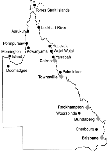 We obtained data from the Queensland Health Pap Smear Registry for the period March 1999 to February 2001. Our analysis was restricted to women aged 20–69 years, as this is the target group for the program.14 Women living in 13 discrete rural and remote Indigenous communities (Box 1) were identified, based on their reported place of usual residence, for any smear taken during the 24-month period. By identifying Indigenous women in this way (rather than by "Indigenous" status as reported on pathology forms) we were able to present information on screening participation for a large number of Indigenous women in several different communities. We obtained permission from the Aboriginal and Torres Strait Islander Health Unit of Queensland Health to analyse community-specific data. In presenting our results, we have concealed the identity of individual communities.