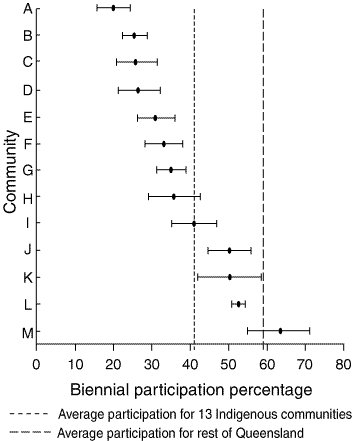 Results: Overall, the biennial participation percentage in the Indigenous communities was 41.1%. This was 30% lower (risk ratio, 0.70; 95% CI, 0.67–0.72) than that for the rest of Queensland. There was statistically significant variation among communities, with biennial participation percentage ranging from 19.9% to 63.5%.