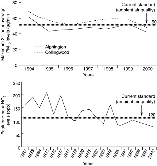 No long-term exposure studies have been carried out in Australia or New Zealand, but short-term time-series analyses suggest that the situation here is similar to that observed in many US and European studies. Significant associations between daily PM10, NOx and/or CO levels and daily cardiorespiratory mortality have been found in Sydney,14 Brisbane,15 and Christchurch,16 but the associations have been weaker in Melbourne17 and Perth.18