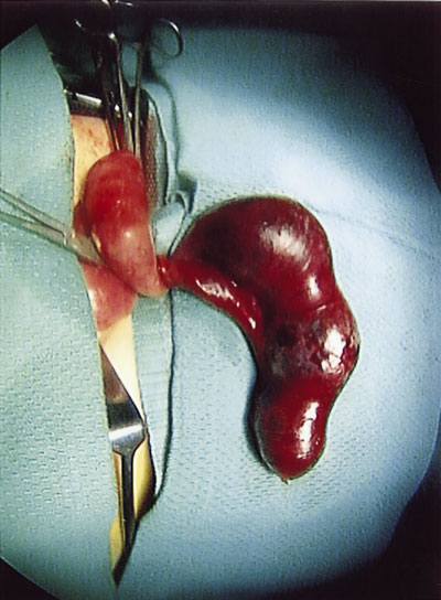 Our patient, a 44-year-old woman, suddenly developed severe abdominal pain while walking, which was unrelieved by narcotic analgesics. Abdominal palpation revealed acute tenderness suprapubically and in the right iliac fossa.