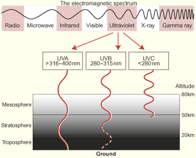 UVR is absorbed by stratospheric ozone in its path through the atmosphere (Box 2). Maximal absorption of UVR occurs in the short-wavelength UVC band and minimal absorption in the longer UVA band. Most UVB is absorbed by stratospheric ozone, but about 10% reaches the lower atmosphere,6 where tropospheric ozone, pollution or cloud cover may further attenuate the amount of UVB radiation reaching ground level. While UVA is implicated in the aetiology of some disorders, it appears that it is UVB that has particular effects on cutaneous DNA and other cutaneous chromophores (light-absorbing molecules) — and, through these, local and systemic effects on the immune system and tumour genesis.5