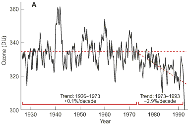 A: Variation in ozone levels 1926–1993 at Arosa, Switzerland (one-year-smoothed data). Courtesy of NASA. SEES: Studying Earth's environment from space. June 2000. Available at <http://see.gsfc.nasa.gov/edu/SEES>.