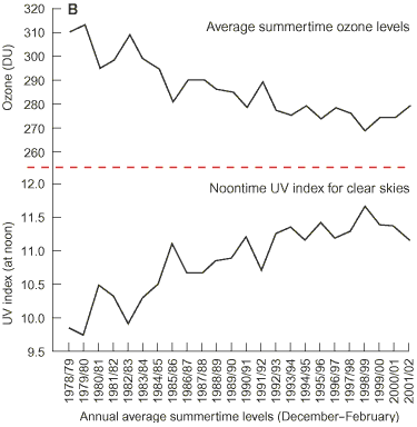 B: Variations in stratospheric ozone and UV index at Lauder, Central Otago, New Zealand, 1978–2002. A clear overall decrease in ozone and increase in UV radiation can be seen over the period 1980–2000. There is a suggestion of a recovery since then, but the time is too short to detect it unambiguously over the natural variability (Richard McKenzie, National Institute of Water and Atmospheric Research, Lauder, NZ, personal communication).