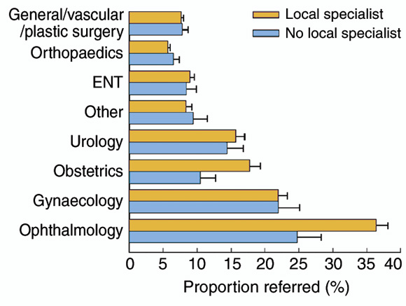 This analysis shows that the presence or absence of a local specialist does not significantly affect the proportion of general surgical (including vascular and plastic surgery), orthopaedic, ENT, urological or gynaecological problems referred by GPs. Antenatal and eye problems, however, are over 40% less likely to be referred by GPs without a local specialist, an effect greater than the other influences on referral which were included in the model.