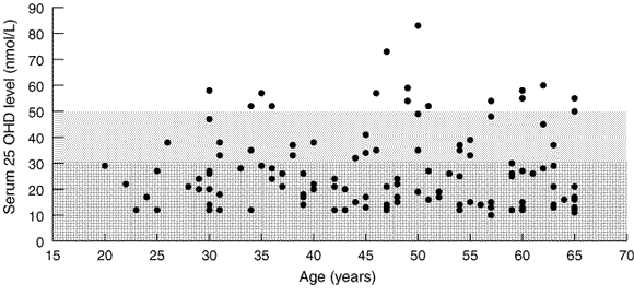 Main outcome measures: Bone turnover as measured by urinary deoxypyridinoline (DPYD) excretion rates; and vitamin D status as determined by 25-hydroxyvitamin D (25OHD) levels, serum calcium levels and parathyroid hormone (PTH) concentrations.