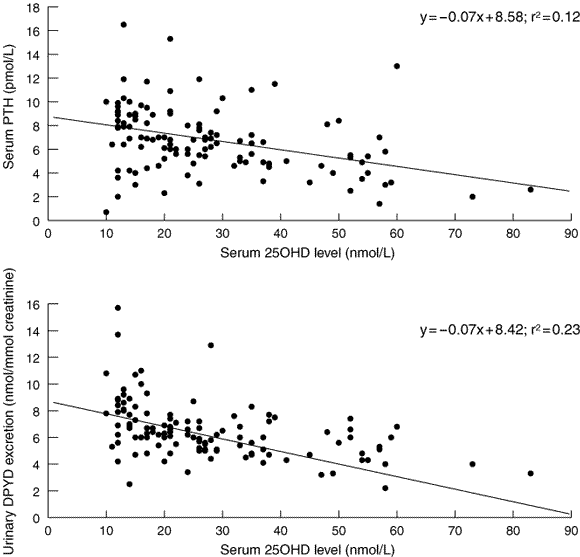 Hyperparathyroidism occurred in 46 (38.6%) women. Box 2 shows the correlations between serum 25OHD levels and PTH levels, and urinary DPYD excretion rates. An elevation in urinary DPYD excretion occurred when the serum 25OHD level was < 30 nmol/L.