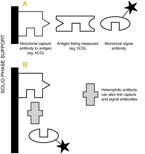 Monoclonal antibodies used in diagnostic assays are produced using animal cells, usually from mice. The Achilles heel of this apparently highly specific assay principle is that many individuals, possibly up to 40% of the general population, possess naturally occurring antibodies to animal immunoglobulins (eg, to mouse, rabbit, cow, rat, goat),3 termed heterophilic antibodies. If an individual with heterophilic antibodies against mouse immunoglobulins has a test by an immunoassay that uses mouse monoclonal antibodies, then the heterophilic antibodies can also form links between the capture and signal antibodies, generating a false-positive signal (Box 1), as occurred in the hCG cases. Another, increasingly important, cause of individuals having antibodies against mouse monoclonal antibodies occurs when antibodies are injected to image or treat tumours.