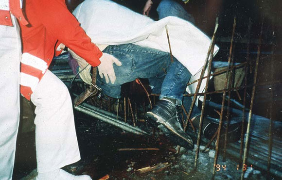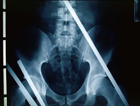 During the extrication process, the patient was covered with a blanket and supported from the back (Figure A). Within 53 minutes of the fall, the patient was admitted to the emergency department. Abdominal x-ray indicated that two rods had entered the abdominal cavity (Figure B). Surgical investigation revealed, in addition to laceration of the right femoral artery, major trauma to the abdomen (perforated rectum, jejunum and duodenum, incomplete rupture of the spleen, and injury to the head of the pancreas). The patient recovered from severe infection of the abdominal cavity with concomitant septicaemia, and was discharged from hospital three months later.