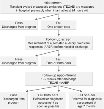 Two approaches to newborn hearing screening have been used — targeted screening of babies with risk factors using criteria such as those of the Joint Committee on Infant Hearing 20009 (Appendix 2), or universal screening of all newborns. As only about 60% of children with congenital hearing loss can be identified by using high-risk criteria,2,3,6 universal hearing screening has been recommended in the United States9 and the United Kingdom.10