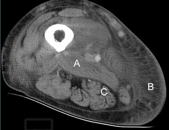 A 55-year-old woman with type 2 diabetes of 8 years' duration experienced, over 2–3 days, the onset of pain, tenderness and swelling of the medial aspect of her right thigh. She had recently commenced insulin therapy and was displaying good glycaemic control (HbA1c level of 6.4%). She had diabetic complications of autonomic and peripheral neuropathy, but no retinopathy. Other medical problems included chronic renal impairment, hypertension, polyarticular gout and hydralazine-induced lupus. A renal biopsy had not been performed, but her renal insufficiency was believed to be a result of diabetic nephropathy and hypertension. She was taking twice-daily mixed insulin (16 units in the morning and 10 units at night), felodipine (10 mg/day), paroxetine (10 mg/day), allopurinol (75 mg/day) and prednisolone (7.5 mg/day). Her serum creatinine level had peaked at 0.31 mmol/L, but stabilised at 0.21 mmol/L after cessation of an angiotensin-converting enzyme inhibitor. A 24-hour urine collection showed a creatinine clearance rate of 0.12 mL/s (normal range [NR], 1.5–2.5 mL/s) and a protein excretion rate of 4.6 g/day. Renal duplex ultrasound showed that her kidney size was well preserved, but there was a suggestion of renal artery stenosis on the right side. There was no history of recent injury or injection to her thigh. She had not experienced any rigors and was afebrile. The area of the localised, tender swelling on the medial aspect of her right thigh was not erythematous and no local lymphadenopathy was noted. Apart from the thigh swelling, there was generalised wasting and weakness of the lower limbs, loss of ankle reflexes, and loss of sensation in a stocking distribution, consistent with a diagnosis of peripheral neuropathy. Examination of her left foot revealed two small gangrenous areas. Foot pulses were present and the gangrenous areas were thought to be caused by inappropriate footwear. ![]() Figure 1: Computed tomography image of the thigh, showing marked oedema and thickening of the adductor muscle group (A), extensive subcutaneous oedema (B), and sparing of the hamstring muscle (C). |