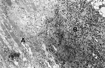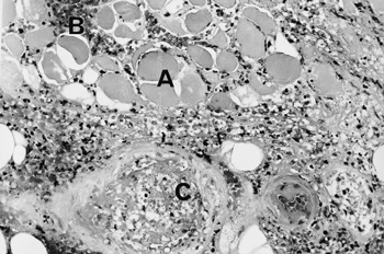 Investigations showed an elevated white cell count of 16 x 109/L (NR, 4.0–11.0 x 109/L), a platelet count of 432 x 109/L (NR, 150–400 x 109/L), an erythrocyte sedimentation rate of 110 mm/h (NR, 7–18 mm/h) and a C-reactive protein level of 119.3 mg/L (NR, 1.6–8.7 mg/L). Creatine kinase (174 U/L; NR, < 215 U/L) and lactate (0.6 mmol/L; NR, 0.5–2.0 mmol/L) levels were normal. Separate to the swelling on the medial aspect of the thigh, a presumed thrombus was palpable in the lateral accessory long saphenous vein. A subsequent ultrasound detected this thrombus extending from the mid thigh to the lateral aspect of the knee, but no deep venous thrombosis was found. She was treated with cephalexin and aspirin. Over the next two weeks, the thigh swelling evolved into a tender, palpable mass measuring 6 x 20 cm. A computed tomography (CT) scan revealed marked swelling of the entire adductor muscle group, but no discrete mass (Figure 1). In the absence of a clear diagnosis, an exploratory operation of her right thigh was performed. This showed no haemorrhage or abscess, but evidence of extensive oedema and necrosis of the adductor muscles. Samples taken for microbiological analysis were sterile. Histological examination of a biopsy specimen showed necrotic muscle, an inflammatory cell infiltrate, fibrosis and evidence of muscle fibre regeneration. The occasional small blood vessel containing fibrin thrombus was also seen, but no features of vasculitis were identified (Figures 2 and 3). A diagnosis of diabetic muscle infarction was made. ![]() ![]() Photomicrographs (original magnification x 250) of a biopsy specimen of the adductor group of muscles. Figure 2: Longitudinal section, showing necrotic muscle fibres (A) and granulomatous tissue (B). Figure 3: Cross-section showing necrotic muscle (A), an inflammatory cell infiltrate (B) and a blood vessel containing a thrombus (C). No evidence of vasculitis was seen. |