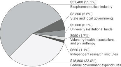 Industry is the largest financial sponsor, investing some US$31 billion, or 55% of the total US investment in medical research. The federal government's contribution (US$18.8 billion) is 33% of the total. It is important to point out that the other sponsors, even though proportionally much smaller, provide a total of US$7 billion and add a degree of flexibility and synergy to the national investment far beyond the dollar value.