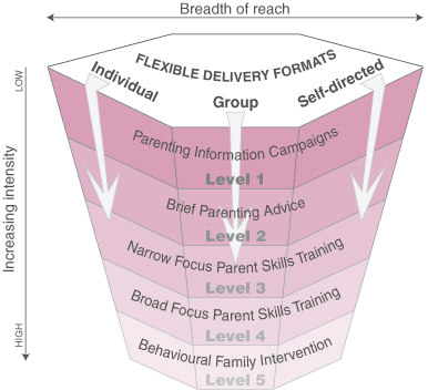 Triple P addresses the broader context by making parenting strategies available to all parents in the community. When fully implemented, the system is a coordinated set of multilevel strategies to provide parents with easy access to information and support about effective parenting. It offers a tiered continuum of interventions of increasing intensity (Levels 1–5; see Box 1 and Box 2), and a specialised intervention for indicated families at highest risk for continued or future child maltreatment. By matching the level of intensity to family need, making parenting information and support broadly accessible to all parents, and promoting the same overarching principles and strategies of positive parenting across all levels of intervention, the system aims to reduce stigma, normalise participation, build continuity across levels of intervention, and optimise population exposure.
