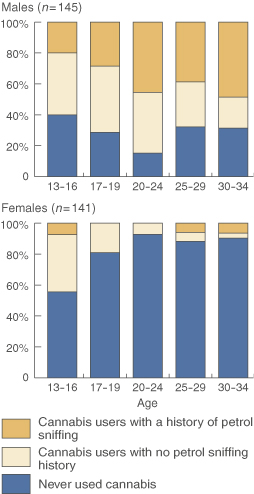 We recently began collecting baseline data to allow us to evaluate the effects on patterns of use of cannabis (and related harm) of community-wide interventions. These interventions will be similar to those implemented for petrol sniffing,2 but with a focus on improved availability of appropriate drug education. We have selected a random sample of about a third of the residents (aged 13–34 years) from two communities. From this sample, current cannabis users (at least weekly) and past petrol sniffers have been identified by using health worker consensus classification, supported by data from review of the health clinic chart and self-report, if available. These data for 145 males and 141 females are presented in the Figure. Among males aged 20–34 years, 74% are current cannabis users and, of these, 60% are former petrol sniffers. To date, 57 cannabis users have agreed to interview (34 males and 23 females) and, of these, 38 met DSM-IV criteria for cannabis dependence.3