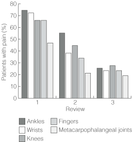 Prevalence of joint symptoms is shown in Box 2. Joint pain was the most common symptom at all three reviews (98%, 92% and 68% of patients, respectively), followed by joint stiffness, myalgia and joint swelling. Prevalence of each symptom decreased at successive reviews. However, at third review, joint pain was still present in seven of the eight participants with pre-existing joint disease (88%) and 25 of the 39 without (64%) (Yates' corrected χ2 = 0.77; P = 0.38). Joint pain most commonly involved ankle, wrist, knee, finger and metacarpophalangeal joints (Box 3), but decreased in prevalence over time at each of these joint types (Box 4).