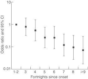 The association between number of joint types with pain and time since disease onset was determined by ordinal logistic regression adjusted for age and sex (Box 5). Odds ratios for having pain in more joint types than within the first four weeks after onset decreased significantly with time (P < 0.001). The odds ratio associated with a change in the number of joints with pain per day since disease onset was 0.98 (95% CI, 0.97–0.99), and per fortnight was 0.72 (95% CI, 0.61–0.85). Consequently, there was a 2% decrease per day in the risk of having more joints with pain than at the first visit and a 28% decrease per fortnight.