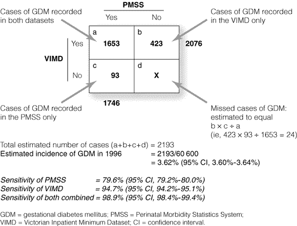Our study used data from the Perinatal Morbidity Statistics System (PMSS) and the Victorian Inpatient Minimum Dataset (VIMD). Linking independent data sources and applying capture–recapture methodology can provide an estimate of the level of incompleteness of a dataset.9 Having identified the cases reported to one dataset only and those reported to both, one can estimate the number of unreported cases and ultimately the total number of cases (Box 1).