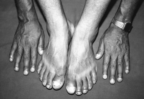 In Nepal, a 28-year-old security guard presented with a seven-year history of peripheral joint pain and clubbing of the fingers and toes (Box, Figure A). He had first noted swelling of his wrists and metacarpophalangeal joints at the age of 16 years, and later his ankles and knees were also affected. The joints were intermittently painful, particularly after he consumed alcohol. The clubbing had developed insidiously. He reported that his brother had similar swelling of the fingers and toes. He also reported excessive perspiration, erectile dysfunction and diminished libido.