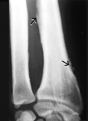 A chest x-ray was normal, but x-ray of the wrist showed periosteal elevation and periosteal reaction at the distal end of the radius (Box, Figure B).