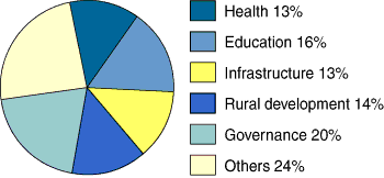 The goal of the Australian aid program is to advance Australia's interest by assisting developing countries to reduce poverty and achieve sustainable development. AusAID manages the Commonwealth Government's overseas aid program, focusing primarily on the Asia Pacific region. The total estimated overseas aid budget is $1.85 billion (0.25% of GDP) for this financial year, an increase of $90 million over last year.6 The key sectors of the program include health, education, infrastructure, rural development and governance. Gender (promoting equal opportunities for women and men as participants and beneficiaries of development), mental health and environmental protection are issues that apply to all sectors. The estimated expenditure breakdown by key sectors is shown in Box 2.6 Other budget highlights in health include the implementation of the $200 million bilateral and regional HIV/AIDS initiatives over six years, with $38.5 million for the year 2002–2003.