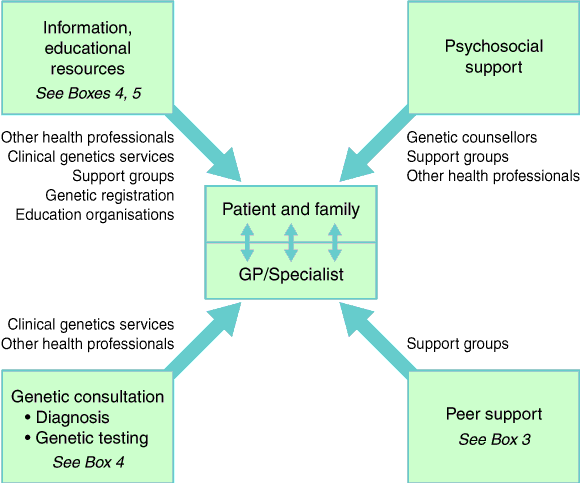 Developments in genetics are rapid and are having an increasing impact on the practice of medical professionals. Families seek up-to-date information and psychosocial support from a range of sources. GPs and specialists are able to enhance patient care by availing themselves of the educational activities and resources provided by clinical genetics services and forming interactive relationships with clinical genetics services and support groups. In taking a pro-active approach, GPs and specialists remain central to the patient's care and ensure their varying and evolving needs are met.