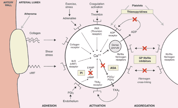 Adhesion of platelets to proteins (collagen, von Willebrand factor), particularly under conditions of high shear stress, and the action of platelet agonists (adrenaline, thrombin, ADP, thromboxane A2) leads to the mobilisation of calcium ion (Ca++), which functions as a mediator of platelet activation. Aspirin inhibits thromboxane A2 synthesis by irreversibly acetylating cyclooxygenase-1; the thienopyridines (clopidogrel, ticlopidine) irreversibly block the ADP receptor; and glycoprotein IIb/IIIa inhibitors block the final common pathway of platelet activation leading to fibrinogen cross-linking of platelets and platelet aggregation. Phosphodiesterase inhibitors (dipyridamole, cilostazol) elevate intracellular cyclic AMP levels and thereby inhibit platelet function.