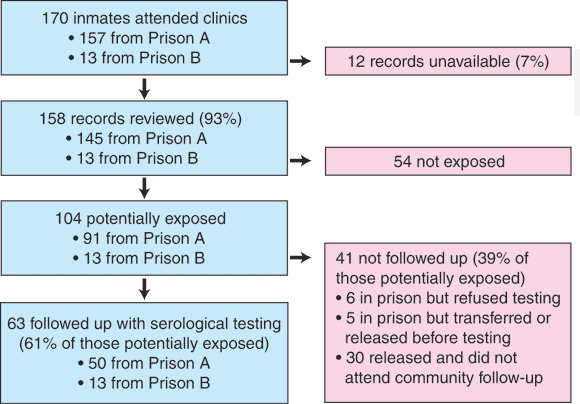 Baseline serological results were available for all 104 potentially exposed inmates (Box 2). Seventy-four were still in prison when their medical records were reviewed, and follow-up serological testing was conducted in 63 (61% of those potentially exposed) (Box 1).