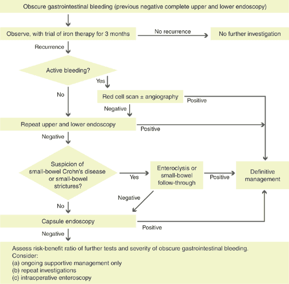 In our cohort, OGB was the main indication for referral for capsule endoscopy. For investigating OGB, this technique has been reported to have a greater yield than push enteroscopy;6-9 this is similar to our experience.2 In addition, although the reported yield for push enteroscopy in OGB is 38%–75%, the true yield is lower because many of these findings (28%–75%) are within reach of an endoscope.10 Therefore, a repeat endoscopy is justifiable in OGB. However, push enteroscopy is still useful for biopsy and applying local therapy beyond the reach of a normal endoscope. A repeat colonoscopy is also appropriate in OGB, as lesions may be missed on the first colonoscopy,10 especially if the bowel preparation was suboptimal. Hence, we suggest repeating upper and lower endoscopies before capsule endoscopy. We propose an algorithm for investigating OGB in Box 5.