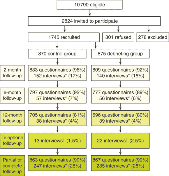 Results: Follow-up information was available for 1730 women (99.1%), 482 of whom underwent psychological interview. There were no significant differences between control and intervention groups in scores on Impact of Events or Edinburgh Postnatal Depression Scales at 2, 6 or 12 months postpartum, or in proportions of women who met diagnostic criteria for a stress disorder (intervention, 0.6% v control, 0.8%; P = 0.58) or major or minor depression (intervention, 17.8% v control, 18.2%; relative risk [95% CI], 0.99 [0.87–1.11]) during the postpartum year. Nor were there differences in median time to onset of depression (intervention, 6 [interquartile range, 4–9] weeks v control, 4 [3–8] weeks; P = 0.84), or duration of depression (intervention, 24 [12–46] weeks v control, 22 [10–52] weeks; P = 0.98).