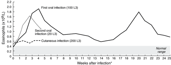 Results: A marked blood eosinophilia followed a single oral exposure to 100 infective larvae, while faecal examination remained negative. Eosinophil counts then declined gradually, although a rapid, spontaneous rise several months later, at the beginning of spring, possibly indicated reactivation of dormant larvae. Blood eosinophil numbers did not rise significantly after percutaneous infection with 200 larvae. A subsequent, smaller, oral inoculum of 20 larvae provoked an eosinophil response similar to that of the first experiment.