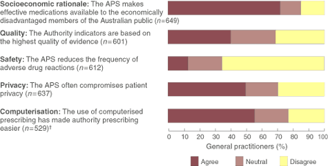 Results: 72% of doctors agreed that the APS makes effective medications available to the socioeconomically disadvantaged members of the Australian public and 50% agreed that it compromises patient privacy. Fewer agreed that authority indicators were based on the highest quality of evidence quality (40%) or medication safety (12%). Doctors placed more emphasis on the doctor–patient relationship than on the criteria for authority prescribing in their decisions about prescribing APS medications. Doctors who used computers to prescribe were more likely to agree that computers can improve the authority prescribing process.