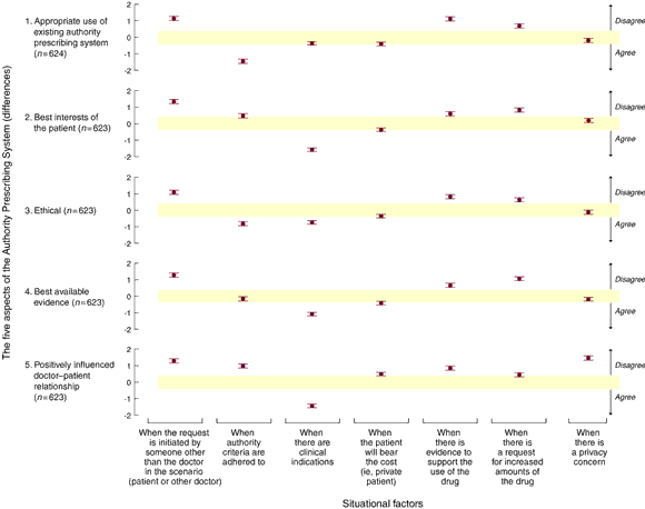 A hierarchical model was fitted to each of the five aspects of concern about the APS, where the doctors' responses were assumed to be random and the eight situational factors fixed for each vignette. Familiarity with medication was dropped from the model because it was linearly dependent on the other factors. The coefficients from the model estimated the degree of change in agreement with the statements (ie, the "difference") when the situational factor was present compared with when it was absent. Thus, the difference measures how much importance doctors placed on the situational factors across the five aspects of concern about the APS. Because the sample in this study was large, all the situational factors were statistically significant, even though some of the differences were not of practical value. By convention, differences were considered to be of practical value when the absolute difference is ≥ 0.4, and highly significant when > 0.1. A positive difference denoted disagreement and a negative difference denoted agreement. Data were analysed in STATA.9