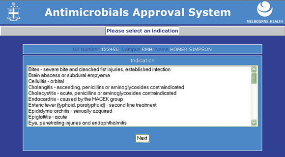Prescribers were required to log into the form using their hospital network log-in code as identification, to enter the patient's medical record number and check that correct patient details were displayed, and then to choose the drug and indication from drop down lists.