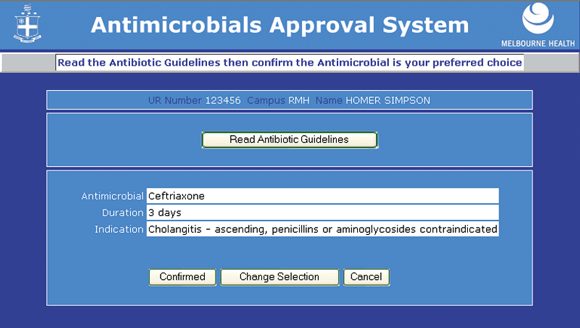 The approval system has potential benefits beyond improving use of broad-spectrum cephalosporins. The web-based form may save time for both prescribers and authorising doctors compared with telephone-based systems. Other hospitals have expressed interest in the system; a multicentre system would potentially allow research on the epidemiology of antibiotic use and its relationship to antibiotic resistance genes. The system is a potential model for promoting optimal use of other restricted or expensive pharmaceuticals within the hospital. An expanded system incorporating other restricted antibiotics and linking prescribing to laboratory Results and decision support systems is currently being developed.