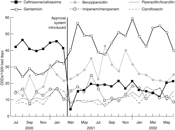 DDD = defined daily dose. After introduction of the approval system in March 2001, there was a significant decrease in use of ceftriaxone/cefotaxime (P = 0.002) and significant increases in use of gentamicin (P = 0.0001) and benzylpenicillin (P = 0.01).