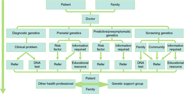 Family screening can be arranged through GPs or specialists, depending on their knowledge and the complexity of the underlying disorder (Box). On the other hand, the value of community screening varies from case to case, and consent is a more complex issue. For example, PKU screening is universal in developed countries and has saved countless individuals from intellectual handicap, whereas community screening for haemochromatosis is still controversial.2,3 Many individuals and families, prompted by media stories, will approach their GP to inquire about genetic testing, making the healthcare professional an important "gatekeeper" for genetic knowledge. The GP will have appropriate resources to answer some questions, but in other cases should refer to the specialist or make use of other healthcare professionals and genetic support groups.