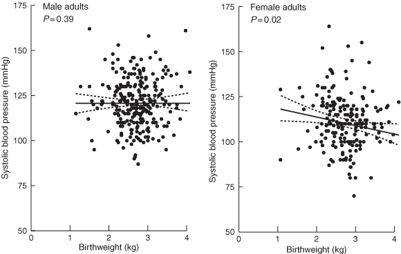 A similar relationship between birthweight and blood pressure has been found across the world in different populations, and at different age groups, from the newborn period to adulthood.6 The magnitude of the effect is similar. Other studies have also confirmed the amplifying effect of higher weight on this phenomenon. The apparently more marked effect in women than men has also been noted in some other studies, although the reasons remain unclear. However, a recent meta-analysis did not find a sex difference in the relationship between birthweight and systolic blood pressure.15