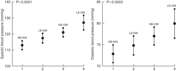 Box 5 shows that adults with normal birthweight and normal current BMI had the lowest mean systolic and diastolic blood pressures, and the group with low birthweight and high current BMI had the highest mean blood pressures. For the overweight as well as the normal BMI group, those with low birthweights had higher blood pressures than those with normal birthweights.