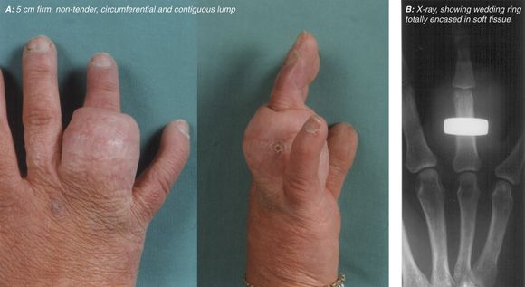 Investigations confirmed the diagnosis of hypothyroidism and indicated anaemia due to iron deficiency (Box 2). An x-ray of the lump (Box 1, B) revealed a wedding ring totally encased in the soft tissue. The patient was started on thyroxine and antipsychotic medication and transferred to a psychiatric institution, with marginal improvement in her mental state. Her daughter was removed to the care of child welfare authorities. The wedding ring was surgically removed. Histopathological examination of the lump revealed a foreign body granuloma with chronic low-grade Staphylococcus aureus infection.