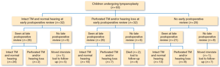 Sixty-four children (69%) underwent early postoperative review (median follow-up interval, 11 months) and 73 children (78%) underwent late postoperative review (median follow-up interval, 103 months). More of the patients had a late review because, at the time, additional resources were available to actively locate the patients for follow-up. At late postoperative review, 56/93 (60%) patients had a successful outcome (intact tympanic membrane and normal hearing) and 17/93 (18%) did not (20/93 [22%] did not undergo late postoperative review).