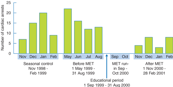 Our favourable findings may have been due to a high incidence of cardiac arrests in the control period or an abnormally low seasonal incidence in the intervention period. Australian data show a cardiac arrest incidence ranging from 36 to 51 per 10 000 admissions.2,8 In the “before” period, there were 30 cardiac arrests per 10 000 hospital admissions, and there was no statistically significant seasonal variation in the incidence of cardiac arrests in our hospital. Furthermore, the 4-month MET intervention period included, by chance, 3 months immediately after the start of the working year for new interns (a possible seasonal bias against the MET), whereas the control period did not.