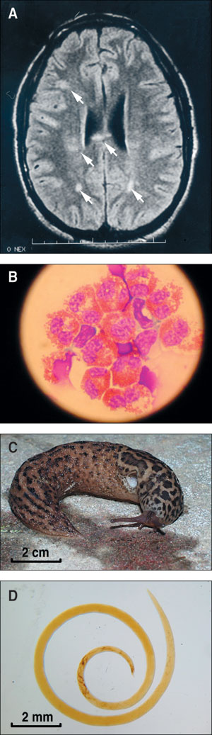 In 2001, a young man was admitted to hospital with a 3-day history of gradual-onset headache, nausea, vomiting, neck stiffness and photophobia. Three weeks earlier he had experienced a gastrointestinal illness (nausea, abdominal cramps, diarrhoea, myalgia and fever) that persisted for 1 week. On examination, he had a low-grade fever and meningism. A cerebral computed tomography scan showed no abnormality. Peripheral blood eosinophilia (1.6 x 109/L; reference range [RR], < 0.44 x 109/L) was noted, and examination of cerebrospinal fluid (CSF) showed 530 x 106/L monocytes (RR, < 5 x 106/L), 22 x 106/L red cells (RR, < 1 x 106/L), no eosinophils on routine staining, a raised protein level of 1.07 g/L (RR, < 0.45 g/L) and a normal glucose level. He was treated with intravenous aciclovir for 6 days. A CSF polymerase chain reaction test for herpes simplex virus-1 (HSV-1) and HSV-2 subsequently gave negative results. Serological tests for Strongyloides and Angiostrongylus were negative. CSF and blood cultures showed no growth. Twelve days after admission, he was discharged from hospital with resolving meningism. Five days later, increasing headache and drowsiness prompted his admission to another hospital. He was afebrile, drowsy and irritable, with gross bilateral papilloedema. He described mild paraesthesiae in both hands. He had peripheral blood eosinophilia (3.1 x 109/L). Magnetic resonance imaging of the brain with gadolinium contrast showed multiple focal enhancing lesions in the deep white matter of both cerebral hemispheres, including the corpus callosum (Figure A). CSF from cisternal puncture was cloudy, under high pressure and, on routine toluidine blue staining, had 1008 x 106/L polymorphonuclear cells (RR, < 5 x 106/L), 186 x 106/L monocytes and 21 x 106/L red cells. Further staining to detect eosinophils was requested, and 90% of the polymorphonuclear cells were found to be eosinophils (Figure B). His CSF protein level was elevated at 0.8 g/L and glucose level 2.6 mmol/L (50% serum glucose). India ink, Ziehl–Neelsen and Gram stains were negative. Repeated questioning revealed that the patient had ingested, 5 weeks earlier, for a dare, two slugs from a garden in a Sydney suburb. Repeat Angiostrongylus immunoglobulin G (IgG) enzyme-linked immunosorbent assay (ELISA), tested in parallel with the first specimen, was positive, confirming seroconversion. Several leopard slugs, Limax maximus (Figure C), taken from the Sydney garden were dissected without finding larvae (Figure D), but no rats from the vicinity were examined for this infection. Treatment comprised measures to reduce intracranial pressure with repeated CSF drainage, acetazolamide and dexamethasone, initially given intravenously, and then orally. CSF drainage consisted of one cisterna magna puncture and two lumbar punctures. Specific anthelmintic agents were not given. No ocular larvae were seen on regular formal ophthalmological review. He improved gradually and, after 17 days in hospital, was discharged with instructions to take a reducing dose of dexamethasone over 4 weeks. His final lumbar puncture 1 month after admission showed an almost normal CSF protein level (0.5 g/L) and a reduction in CSF white cell count (107 x 106/L; 8% eosinophils). After 5 months, he successfully returned to full-time studies and competitive sport. |