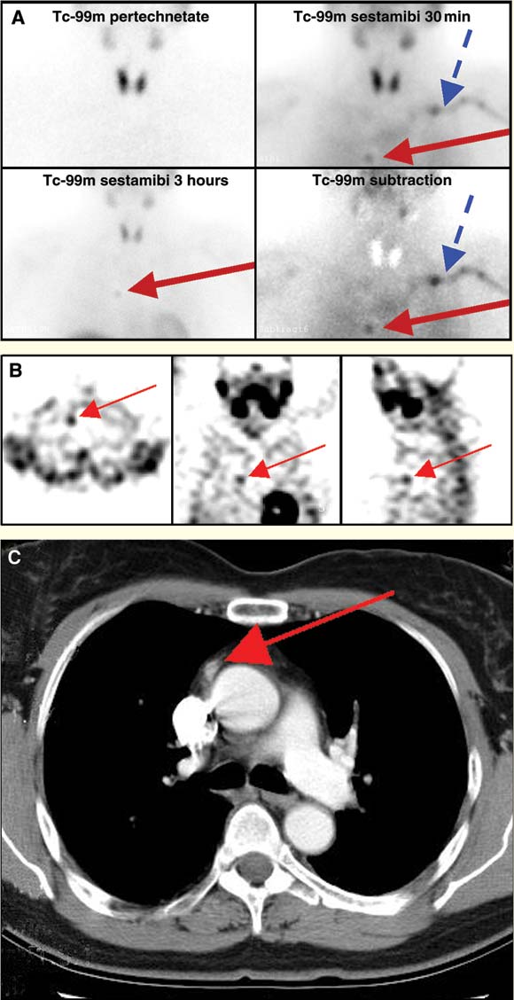 B: Transaxial, coronal and sagittal single-photon-emission computed tomography (SPECT) slices, indicating focus of increased sestamibi activity (red arrow) in the right anterior mediastinum.