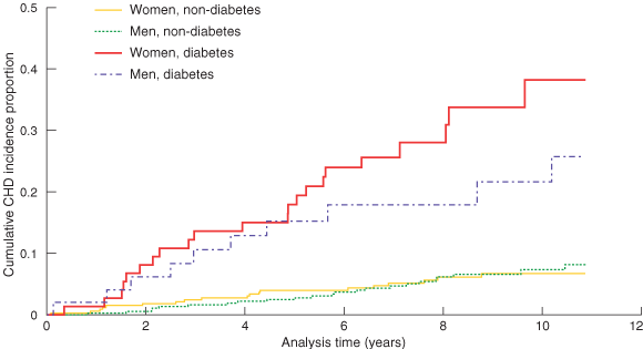 The population-attributable risk fraction (ie, the proportion of CHD events in the study population attributable to the presence of diabetes) in women was 45% (95% CI, 21%–62%) after adjusting for age, and 48% (95% CI, 14%–69%) after adjusting for age, smoking status, alcohol consumption, blood pressure, HDL cholesterol and total cholesterol levels. For men, the population-attributable risk fraction was 11% (95% CI, − 11% to 32%) after adjusting for age, and 3% (95% CI, − 20% to 22%) after adjusting for age, smoking, alcohol consumption, blood pressure, BMI, HDL cholesterol and total cholesterol levels.