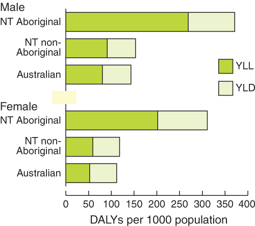 Our study uses the DALY method to determine the burden of disease within the NT population compared with that in the national population, and also quantifies the differences in burden of disease between the NT Aboriginal and NT non-Aboriginal populations.