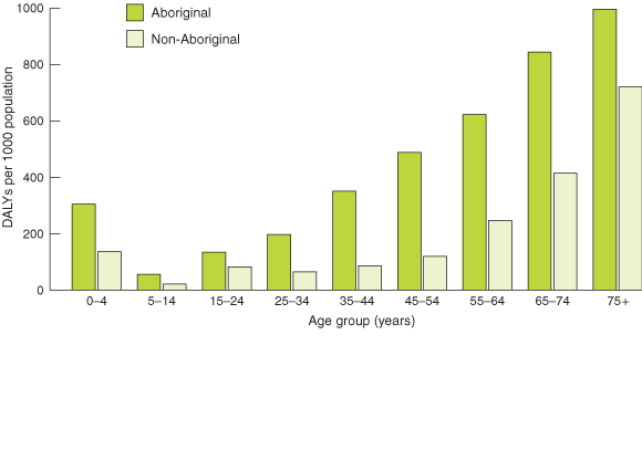 Aboriginal people bear a higher burden of disease and injury per head of population than non-Aboriginal people for all age groups. This peaks in the 35–54-years age groups, where Aboriginal people bear 4.1 times the burden of disease and injury of non-Aborignal people (Box 6). Aboriginal people experience DALY rates at the level of non-Aboriginal people who are 20 to 30 years older, with DALY rates in Aboriginal people aged 45–54 years exceeding those of non-Aboriginal people aged 65–74 years.